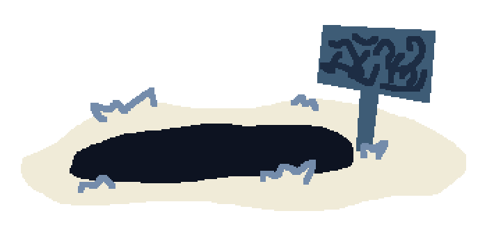 You find a big hole. There's a sign by it, but you can't read what it says.